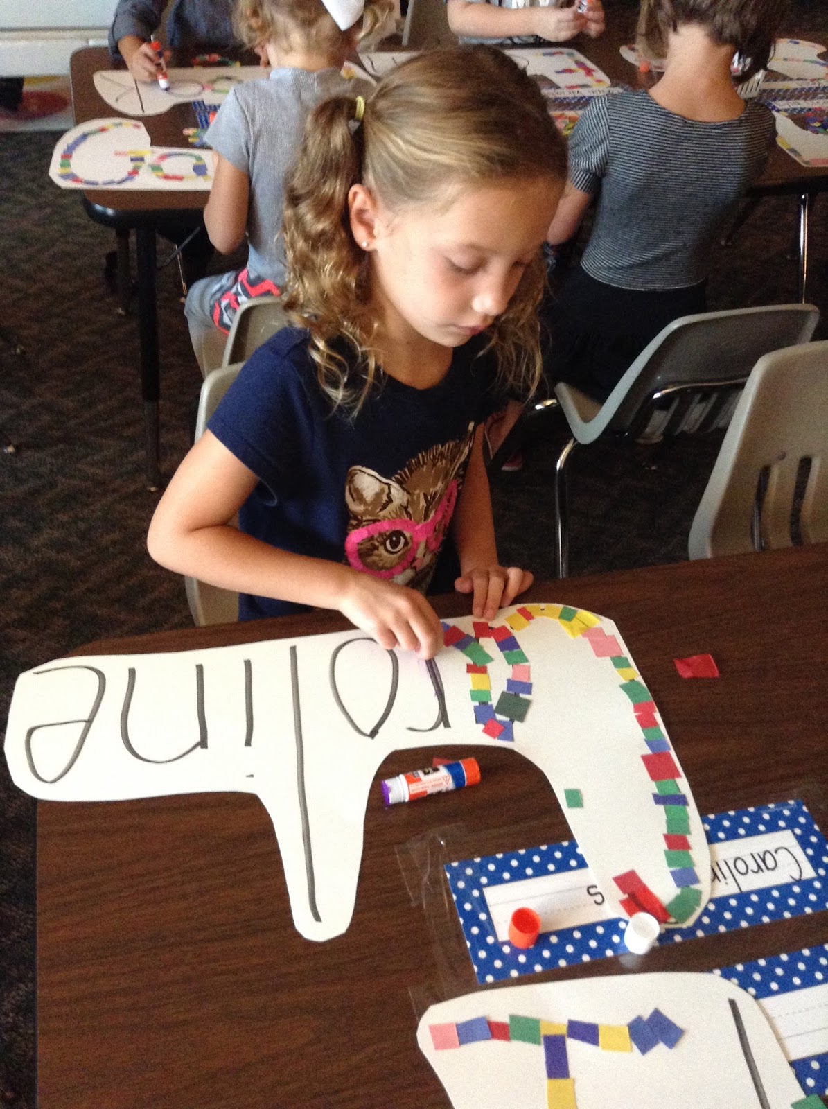 What a great first day!! We had a ton of fun and enjoyed getting to know each other! We all got here at different times, so we made name mosaics with cut up construction paper on our names to pass the time while all our friends arrived at school. It was a great way to practice our letters and recognizing letters in our names.